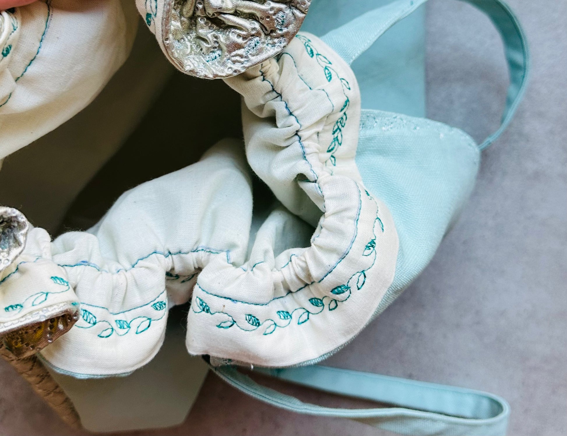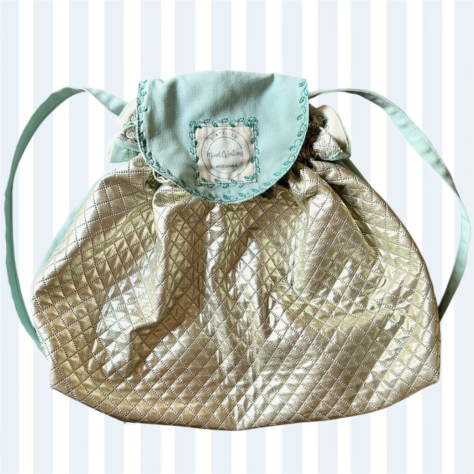 Petit sac à dos, léger en simili cuir matelassé doré et coton bleu clair. Jolis détails brodés motifs feuillages.