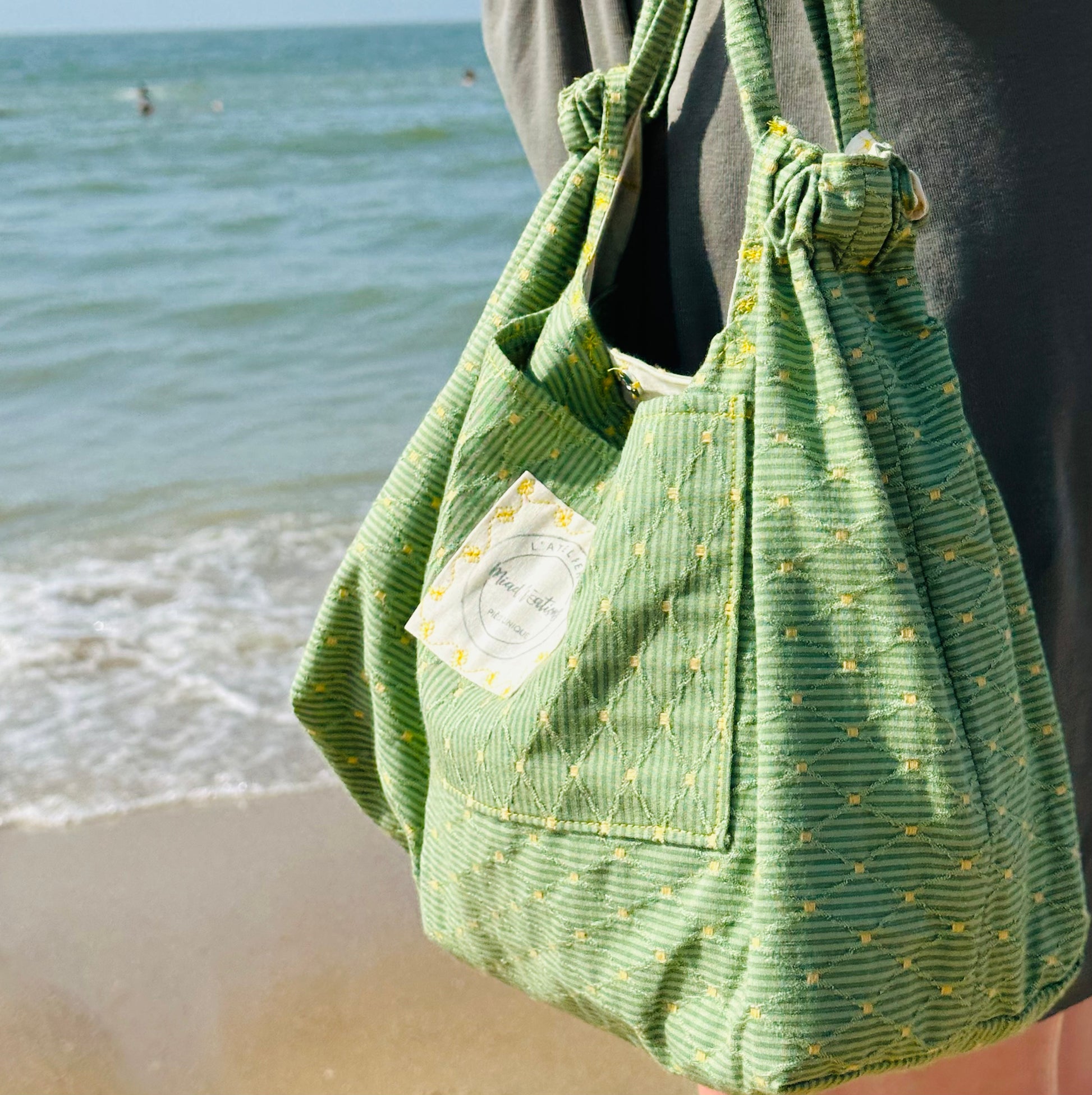 Porté épaule ou à la main. Jolies finitions brodées. Fermeture pression.