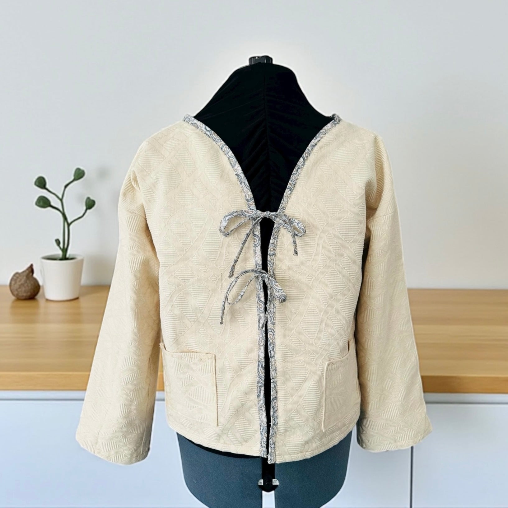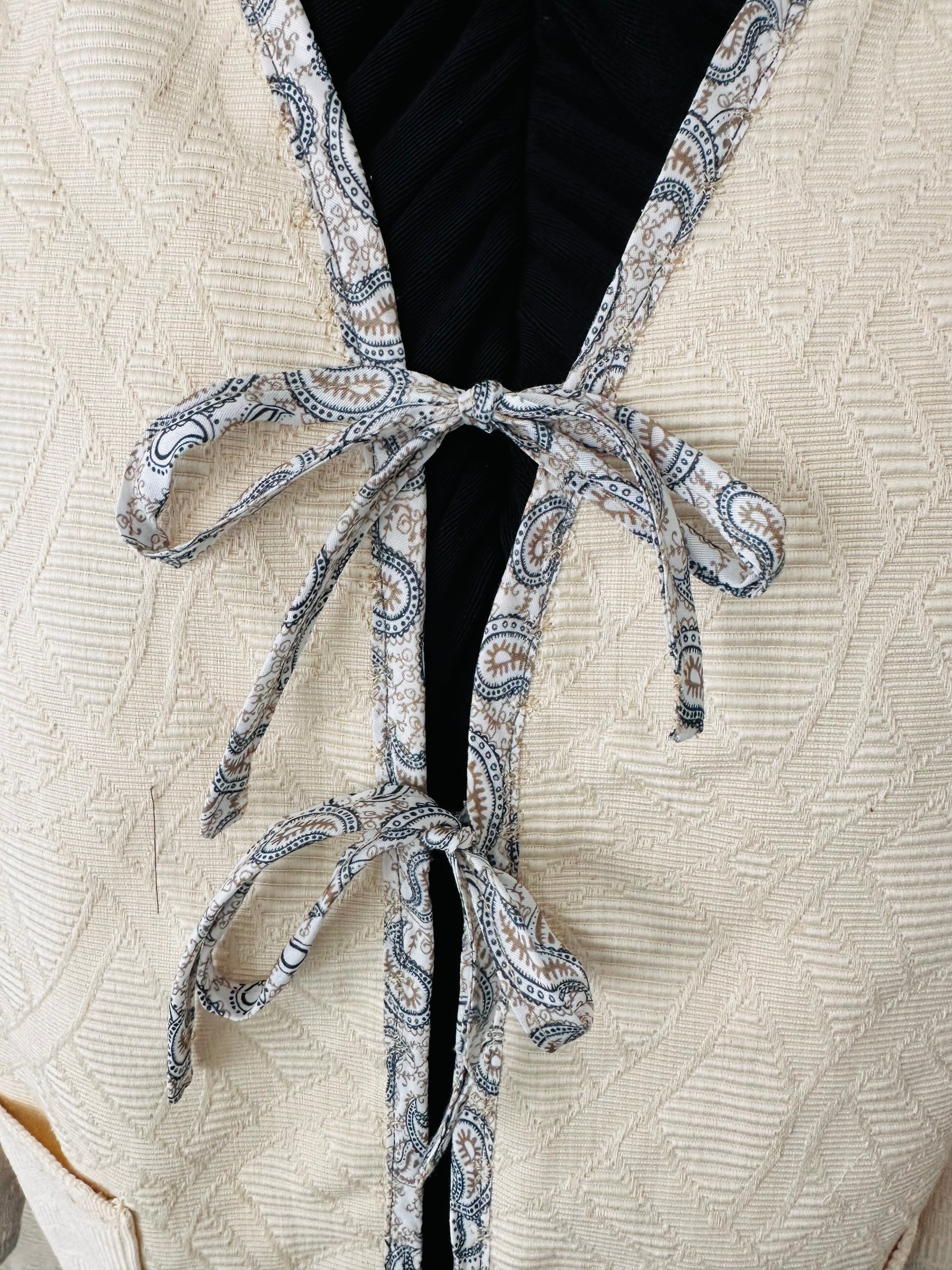 Fermée à l’aide de fines nouettes ornées d’un motif Paisley délicat dans des tons de beige, noir et gris, détails brodés, elle mêle minimalisme et raffinement avec une touche bohème élégante.