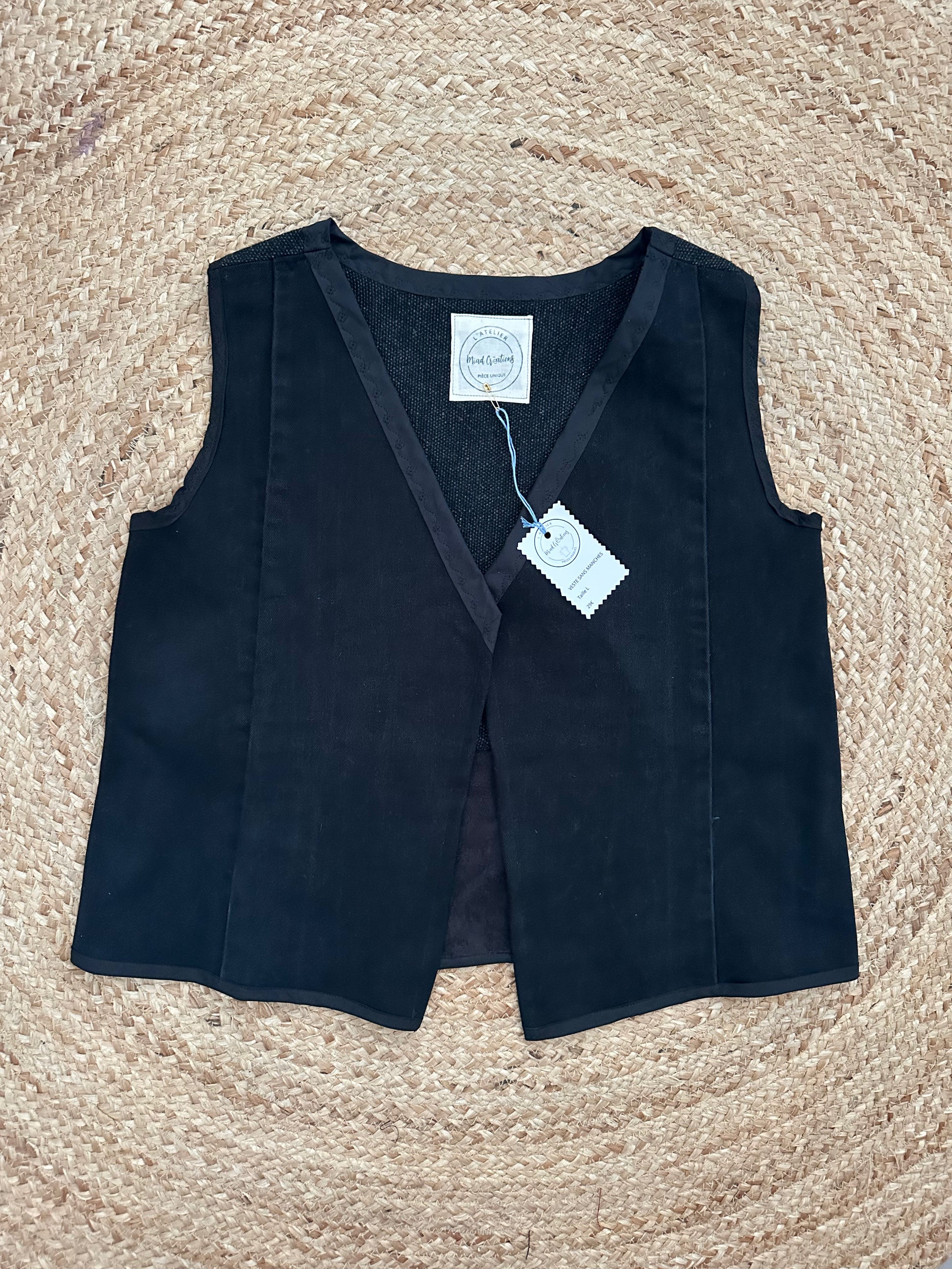 Veste sans manches, en jean noir devant et velour et laine au dos ( super effet monochrome et tri matières : jeans, velours et laine)